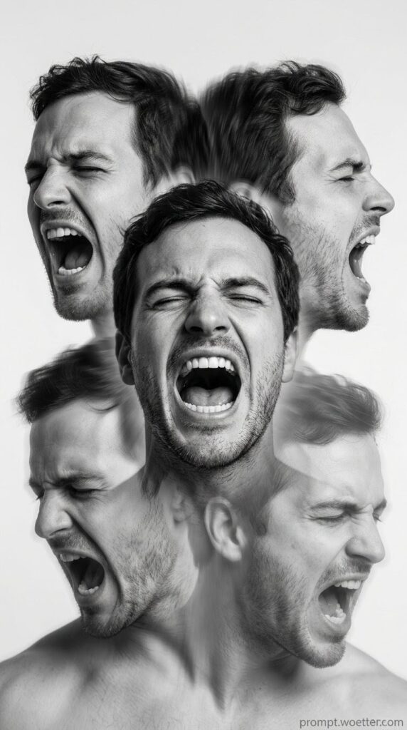 This guide provides an advanced AI image generation prompt to create a striking black-and-white, multi-exposure psychological portrait. Utilizing a 10-part orchestration framework, users are instructed to upload their own photo to generate a visually fragmented, emotionally raw image featuring five screaming faces with progressive radial motion blur. It explores fine art photography concepts, high-contrast lighting, and dissociative visual techniques.