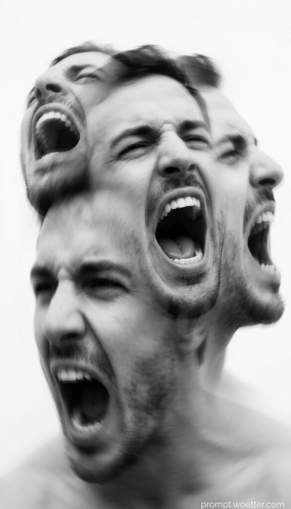 A high-contrast black and white fine art psychological portrait featuring the person from the attached picture. The composition uses a long-exposure multiple exposure technique to show five layered instances of the subject's head arranged in a radial burst pattern against a pure off-white background. The central, largest head is razor-sharp with deep depth of field, tilted upwards at 70 degrees, screaming in raw anguish with eyes tightly shut and mouth wide open. Radiating outward are four progressively blurred and ghosted heads (upper-left, upper-right, lower-left, and lower-right), all sharing the screaming expression with closed eyes. Lighting is soft, diffused, and frontal-slightly-overhead, creating gentle shadows. Render in photorealistic ultra-high resolution, vertical 9:16 aspect ratio. Include a subtle watermark "prompt.woetter.com" in the bottom-right corner at 20% opacity. No color tints, no extra limbs, no props.
